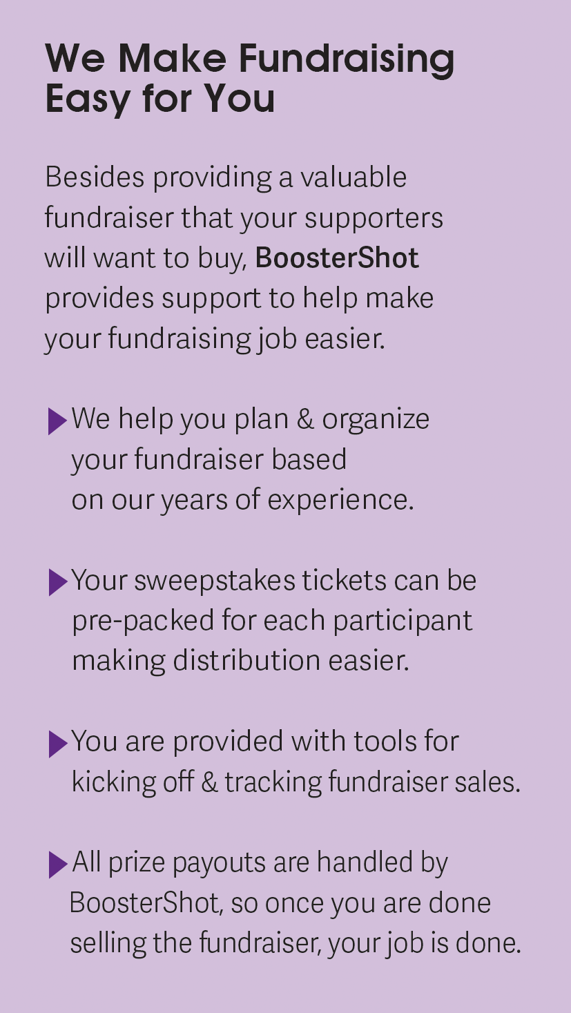 - Easy – All prize payouts are handled for you by BoosterShot. We also provide an online store so your supporters can buy conveniently with a credit card.