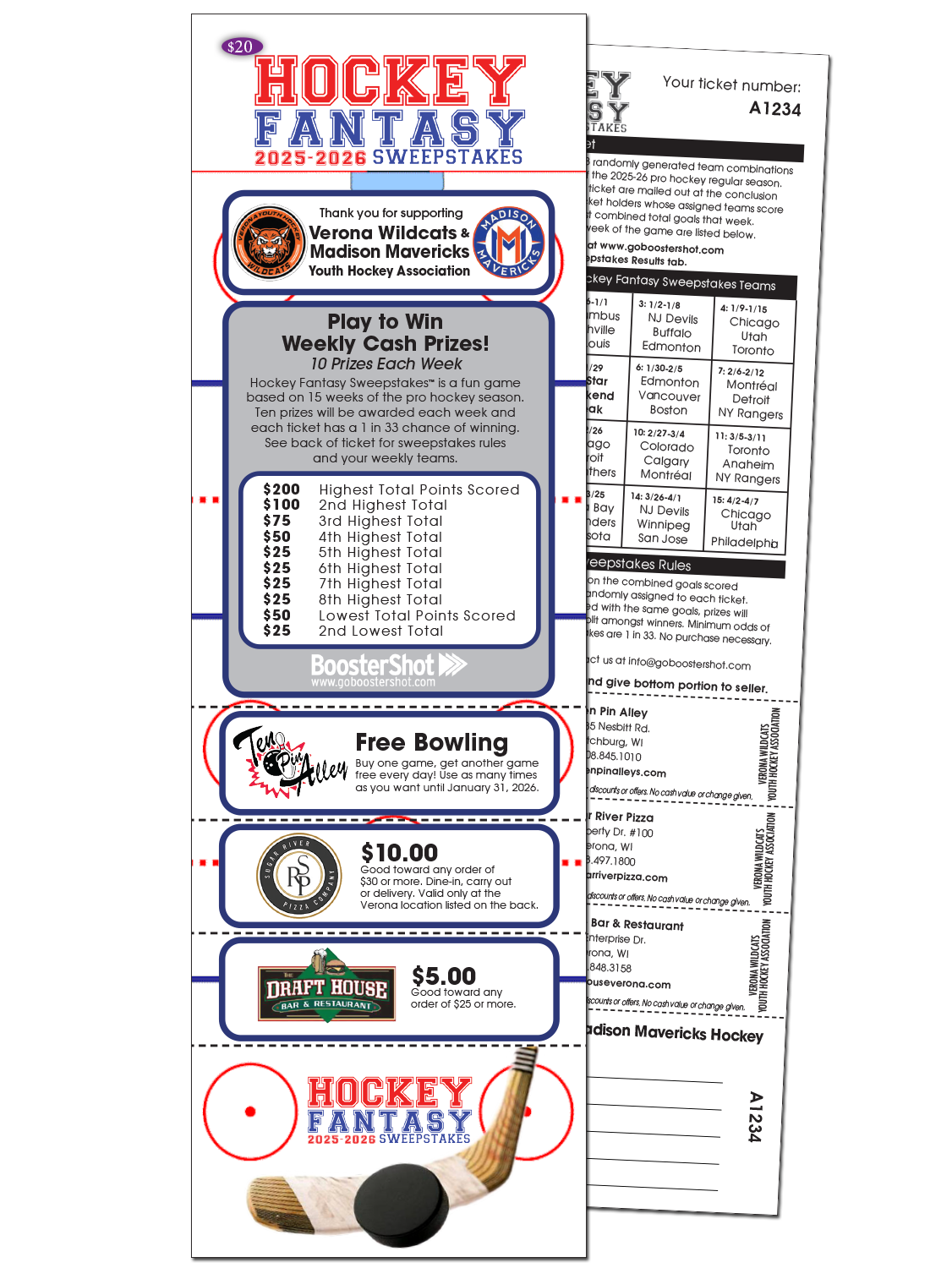 The Verona Youth Hockey Fantasy Sweepstakes Ticket features a fun game with cash prizes based on pro hockey scores.